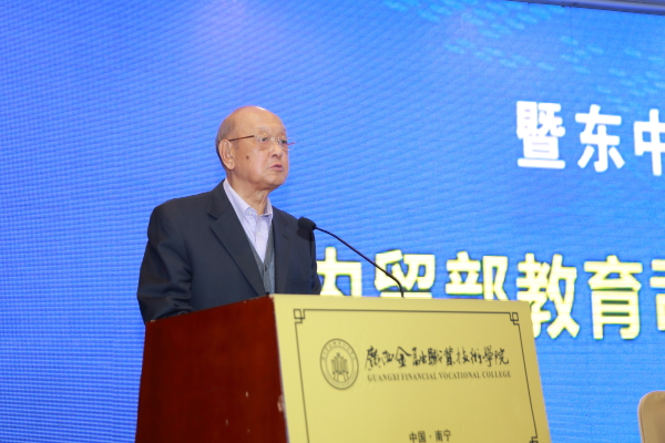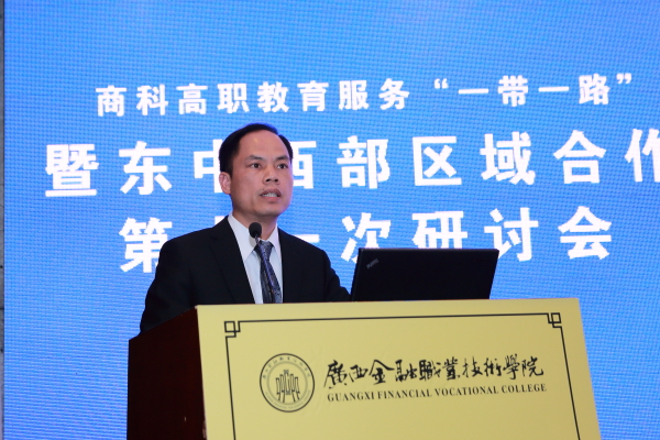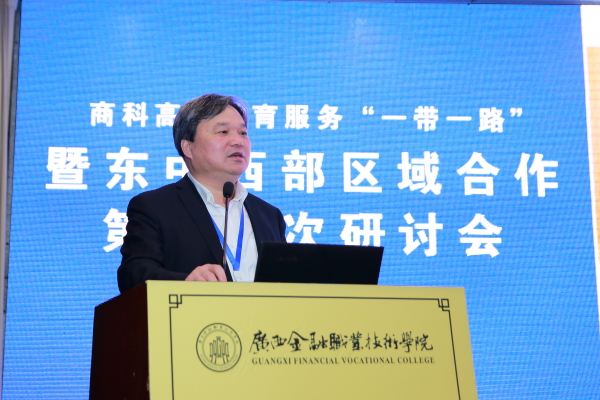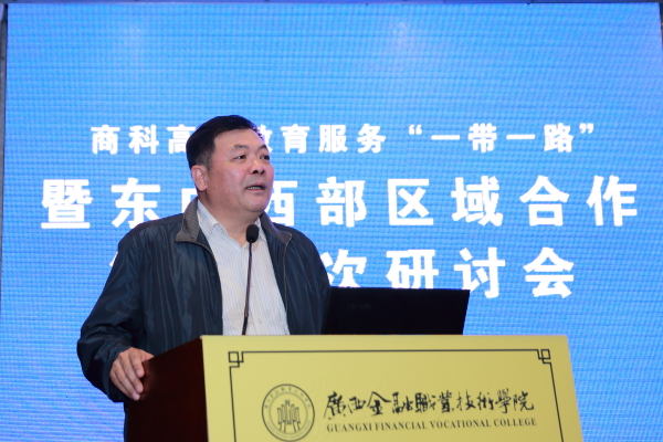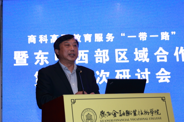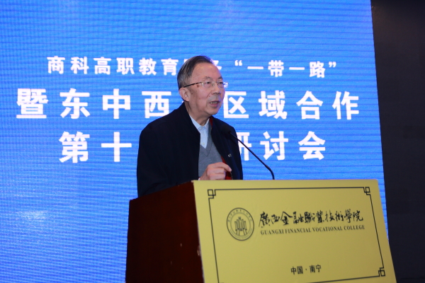 為更好服務“一帶一路”建設,探索國際化發展之路,深化東中西部區域院校合作。11月29日,由中國高等教育學會職業技術教育分會主辦,廣西金融職業學院承辦,廣西經濟貿易職業教育集團協辦的商科高職教育服務“一帶一路”暨東中西部區域合作第十一次研討會在南寧荔園山莊舉行。原內貿部教育司長、商科聯盟名譽理事長王晉卿,原江蘇省教育廳副廳長、國家教育咨詢委員會委員周稽裘,中國高教學會職教分會會長、浙江金融職業技術學院黨委書記周建松,中國職教學會商科專業委員會主任張大成,廣西壯族自治區教育廳職業教育與成人教育處副處長邱金林等來自50多家單位的90余名專家、學者參加了研討會。我院黨委書記沈立君、副院長謝沛善出席會議。