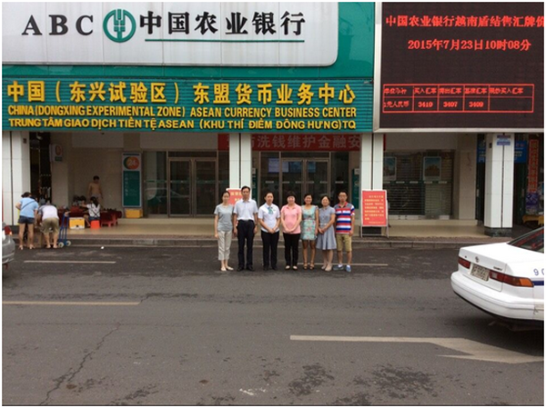 7月23日至24日,沈立君院長帶領2015年廣西高校科學技術研究項目《人民幣跨境投資及國際化政策研究》課題組一行6人到中國農業銀行防城港東興市支行調研人民幣跨境投資及國際化問題。