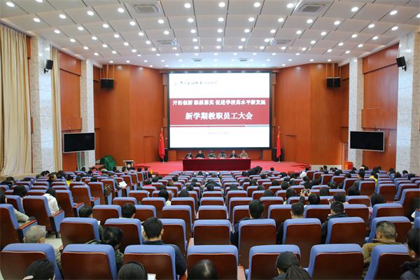 2月24日上午,我校在西校區一號樓學術報告廳召開新學期教職員工大會,學校領導班子及全體教職員工參加會議。