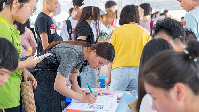 迎新現(xiàn)場,學(xué)校積極推陳出新,展示學(xué)院特色,迎接新生到來。以“我與祖國同框”為主題,紅色迎新結(jié)合新中國成立70周年設(shè)計新時代正能量班級引導(dǎo)牌和宣傳標語,在展示學(xué)校新風(fēng)貌的同時也共祝祖國更加繁榮昌盛。