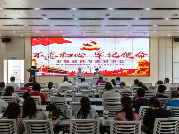 10月9日下午,我校在西校區“新時代講習所”召開“不忘初心 牢記使命”主題教育專題宣講會。特邀自治區黨委第八巡回指導組組長、自治區人民政府參事、自治區決策咨詢委員會專家黃健教授主講。學校科級以上領導干部、全體在職黨員與會聆聽。會議由黨委書記沈立君主持。