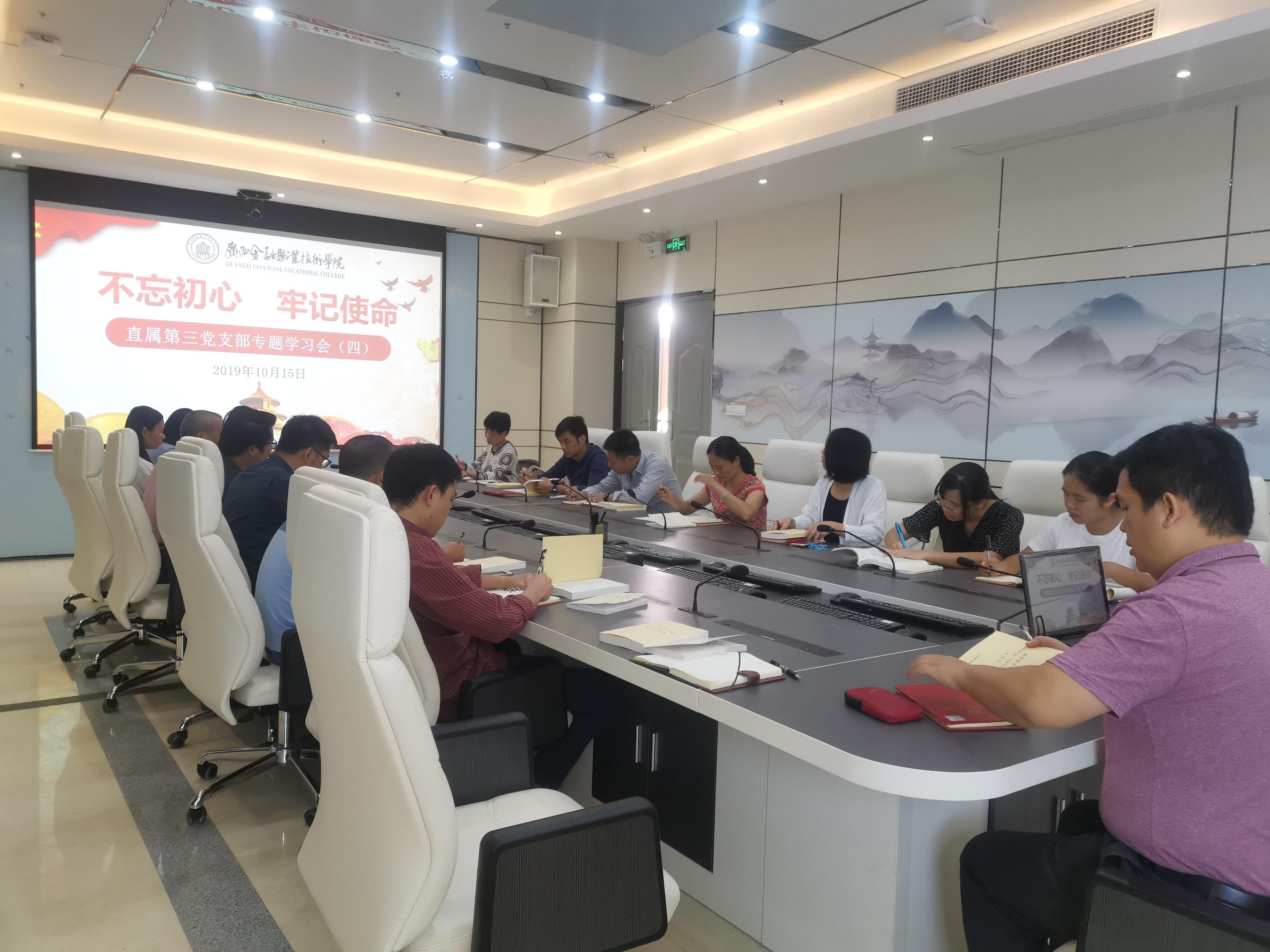 10月15日,直屬第三黨支部全體支部黨員、預備黨員集中西校區行政樓103會議室開展“不忘初心、牢記使命”主題教育第四專題研討學習。會議由支部書記周海峰主持。