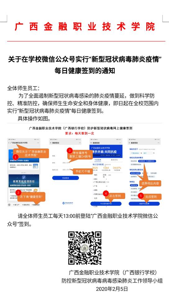 學校微信公眾號特別推出了“健康簽到”功能,要求涉及的12463名師生每天通過微信快速、準確上報個人健康狀況,為及時收集和上報相關信息提供了堅實的保障。