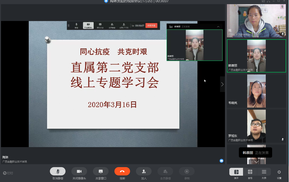 為進一步堅定抗“疫”信心,激勵黨員在戰疫中更好地踐行初心和使命, 3月16日晚,直屬第二黨支部組織全體黨員開展線上專題學習會,并結合疫情防控思政大課課程內容分享了各自的學習心得,學院副院長潘大勝以普通黨員身份參加會議,會議由黨支部書記韓蓓麗主持。