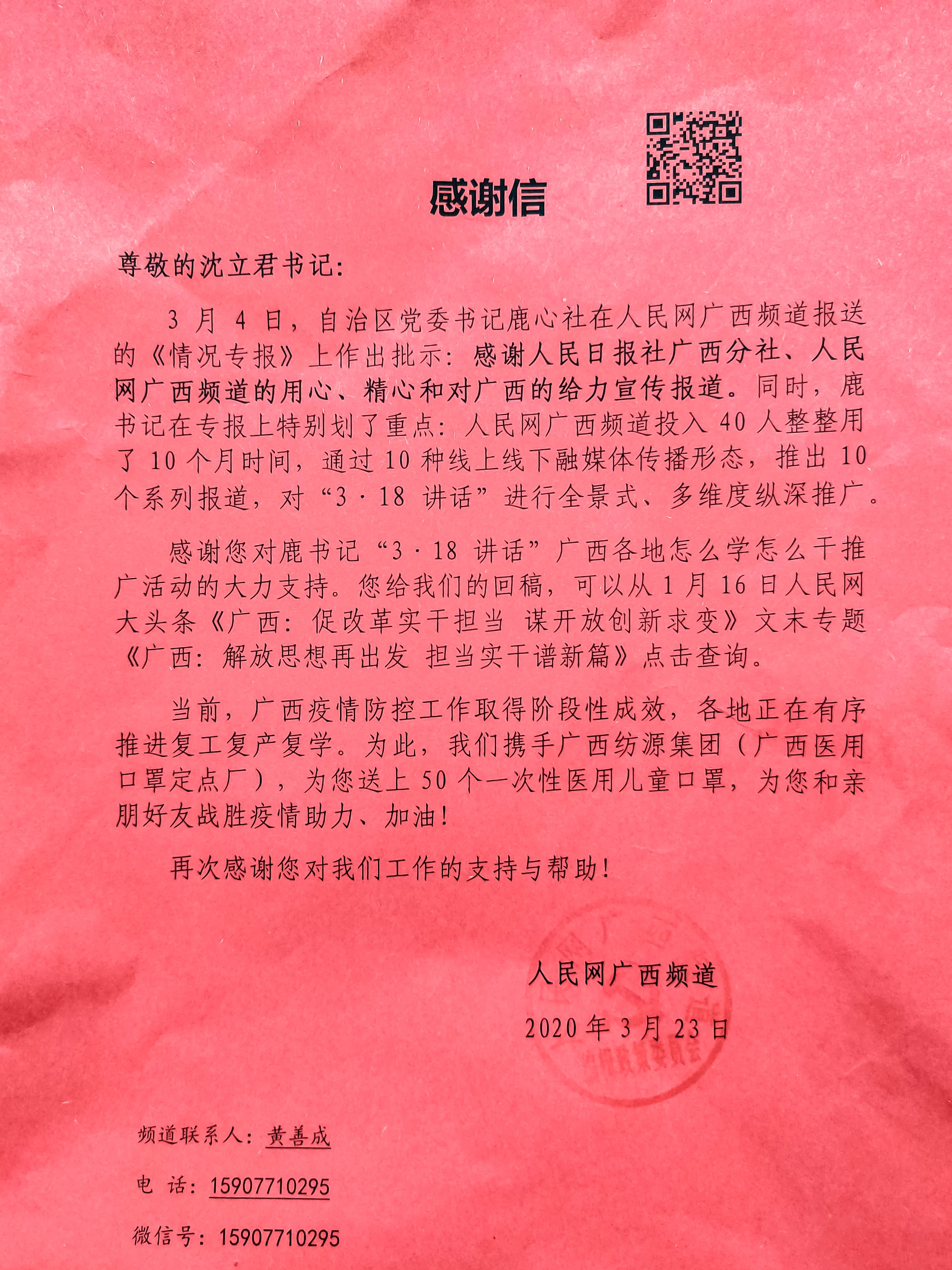 人民網廣西頻道同時隨信贈送口罩50個,用于防疫工作。