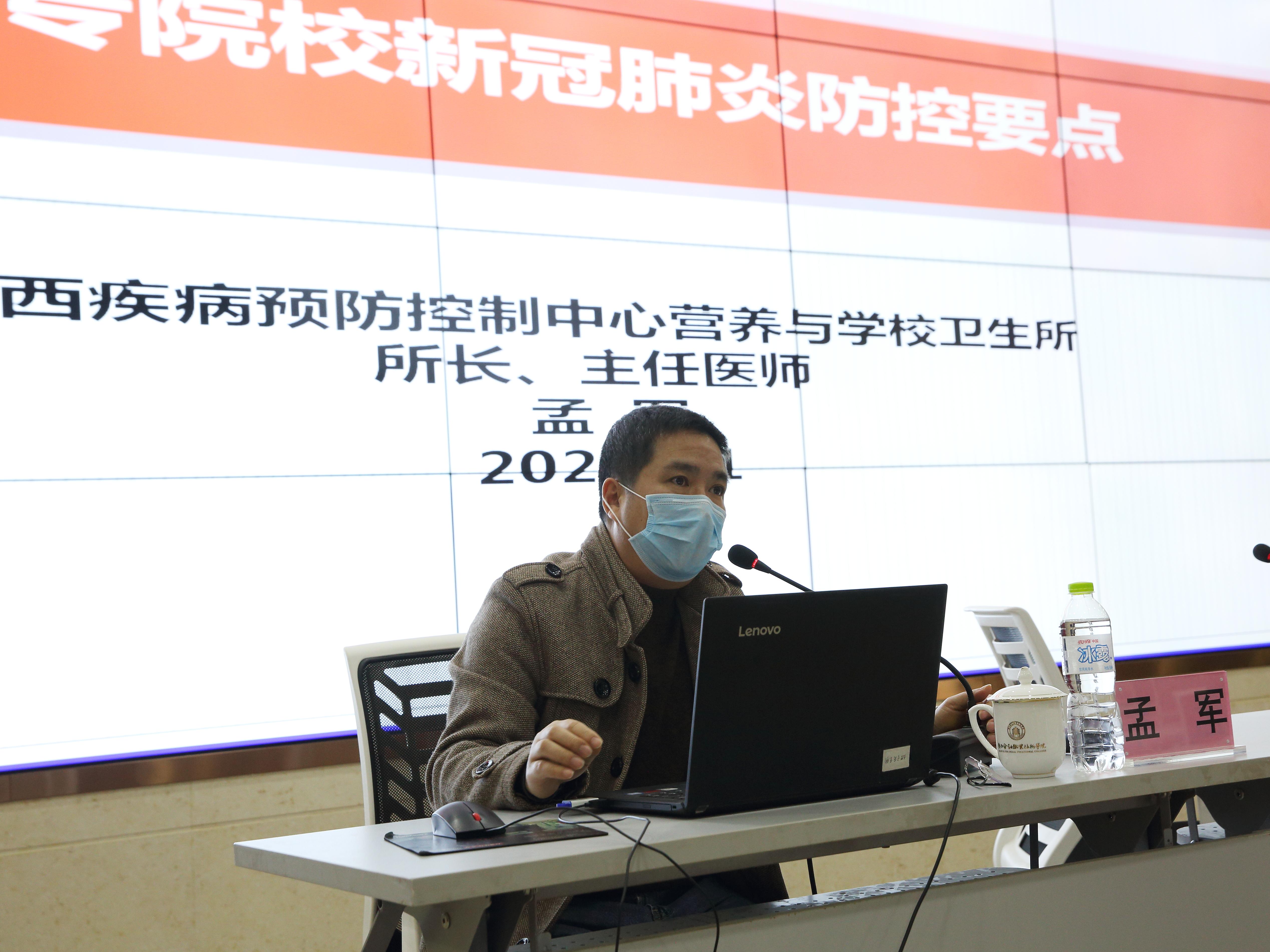 孟軍所長以《大專院校新冠肺炎防控要點》為題,分別從什么是新型冠狀病毒、新冠病毒的傳播途徑、新冠肺炎疑似病狀、如何保持手衛生、如何公共科學戴口罩、開學前的防控措施等幾個方面開展講解。培訓內容豐富、深入淺出,生動形象,具有很強的操作性,進一步增強了我校教職工對疫情防控意識。