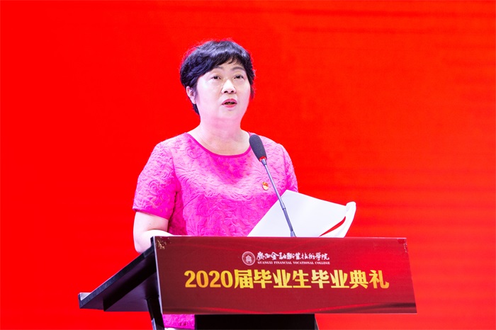 沈立君書記對2020屆畢業生表達了不舍和真摯的祝福。她說,同學們是學校改革發展的見證人、推動者,三年的青蔥歲月,雖即將劃上句號,但未來之路即將在你們腳下展開,請同學們保持求學初心,不忘來時之路,永葆昂揚斗志,實現自我超越。今天的“華麗轉身”,成為了金院最年輕的校友,希望同學們今后初心如磐,秉承家國情懷;追求卓越,堅持創新發展;志成高遠,秉持誠信篤行。每一位同學都能成為有理想、有本領、有擔當的新時代青年,在艱苦奮斗中砥礪前行,在社會磨練中激起最美的浪花,在創新創業中增長才干,不懼風雨、勇挑重擔,成就事業的“金色華章”。