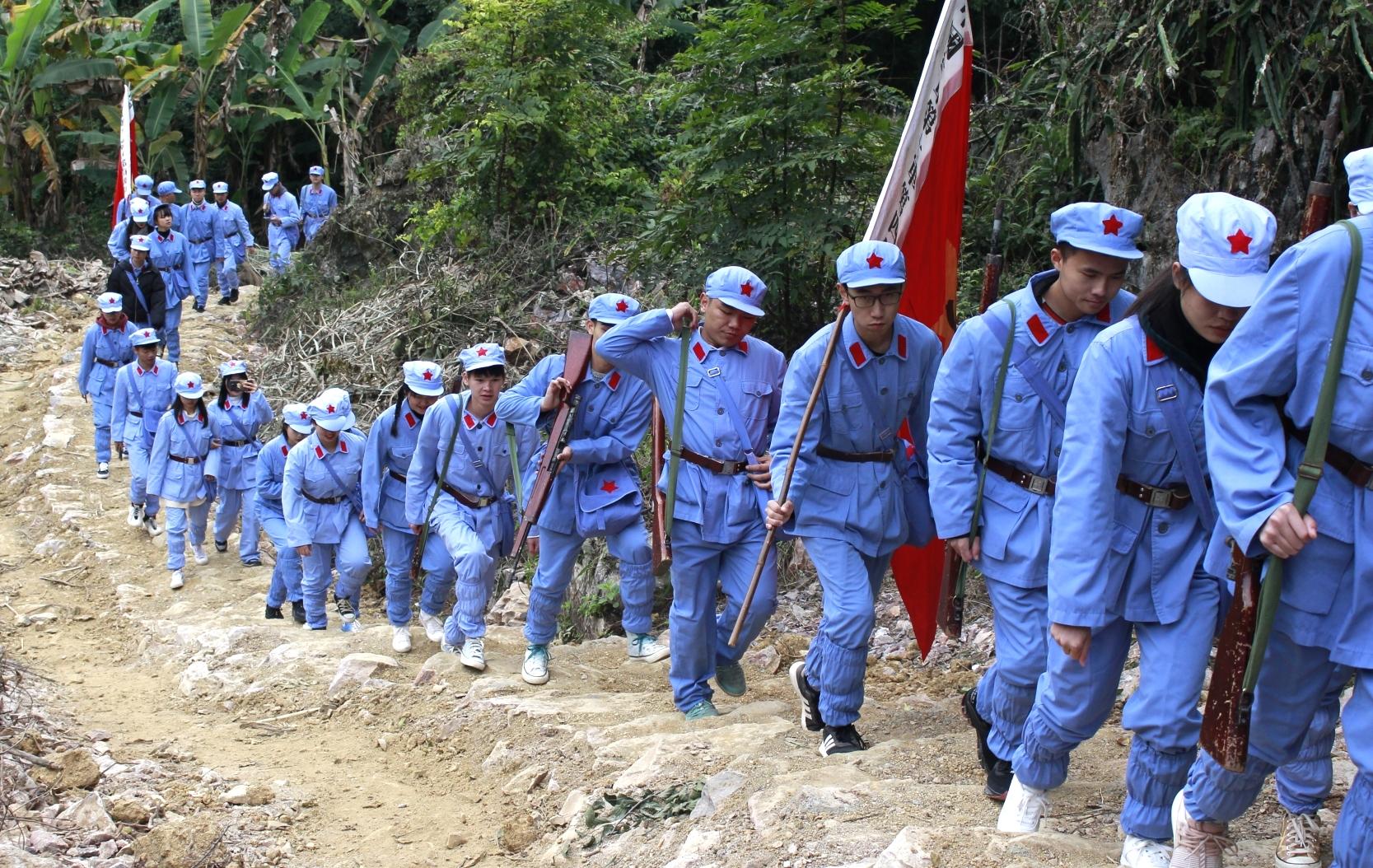 田東,是一片有著光榮革命歷史的紅土地,是鄧小平等老一輩無(wú)產(chǎn)階級(jí)革命家踏上右江地區(qū)第一腳、打響百色起義第一槍的地方,是廣西第一塊紅色政權(quán)——右江蘇維埃政府所在地。來(lái)到田東縣思林鎮(zhèn)真良村,編隊(duì)整訓(xùn)授旗授槍儀式后,學(xué)員們開(kāi)啟實(shí)踐教學(xué)第一程——重走運(yùn)槍小道。扛著紅旗沿著陡峭石壁挺進(jìn),背著長(zhǎng)槍踏著蜿蜒山路前行,感受紅軍在陡峭的小道上運(yùn)載武器的艱辛。學(xué)員們重走這段崎嶇山路,在最為泥濘艱險(xiǎn)的運(yùn)槍小道上,一邊行進(jìn),一邊彎著腰傳著口令,還時(shí)不時(shí)地前后照應(yīng),艱難跋涉兩公里,歌聲飄揚(yáng)兩公里,依然斗志昂揚(yáng)。