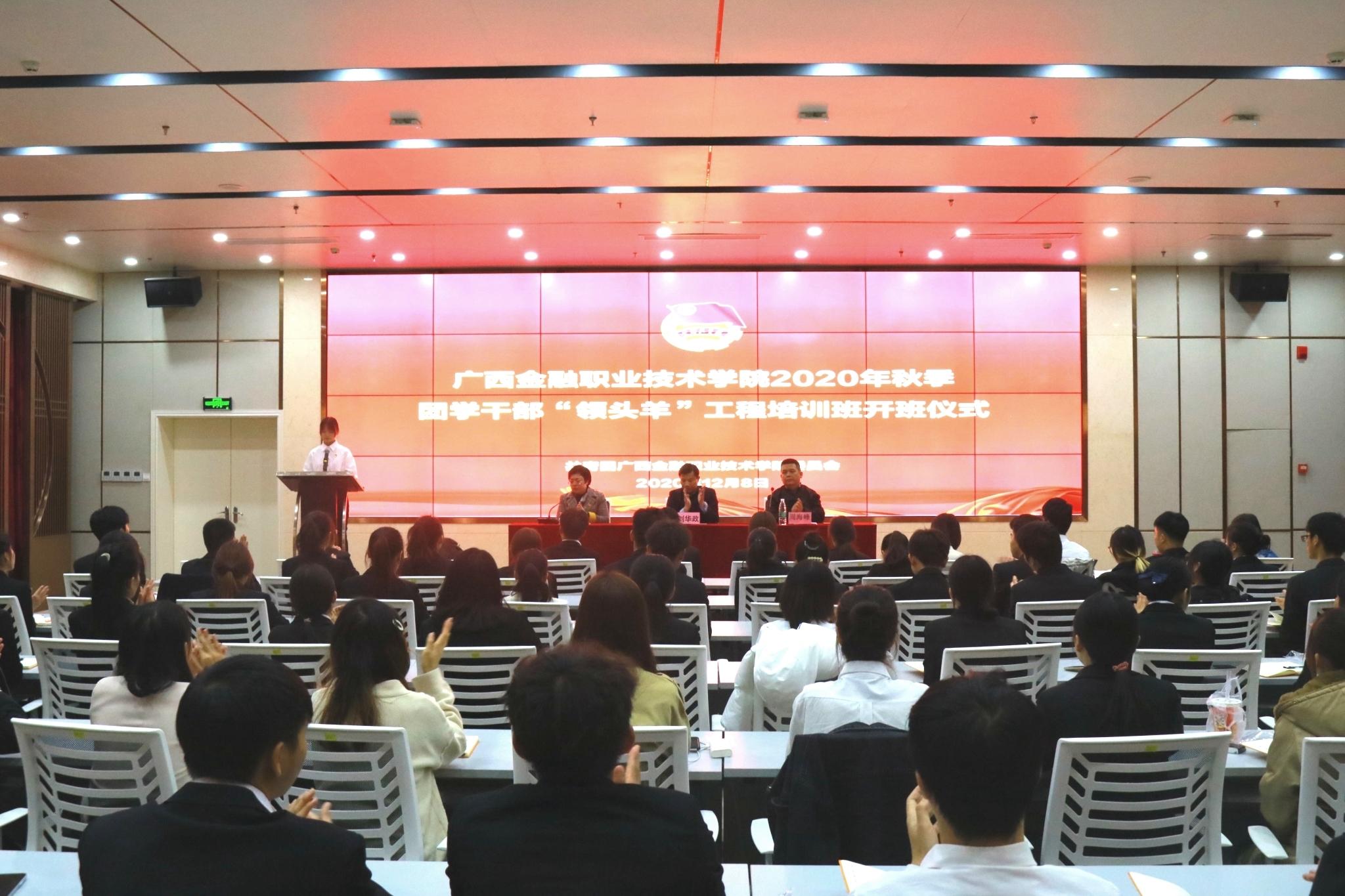 為提高團學干部的思想政治基礎、綜合實踐能力,培養和造就一支政治堅定、作風過硬、素質全面、能力突出的團學干部,12月8日晚,我校在西校區道德大講堂舉行2020年秋季團學干部“領頭羊”工程培訓班開班儀式。學校黨委副書記、紀委書記劉華政,學生工作與招生就業處副處長、校團委書記周海峰、校團委副書記朱麗君,以及團學干部“領頭羊”工程培訓班的122名學員參加開班儀式。開班儀式由校團委副書記朱麗君主持。