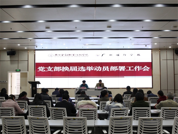 會上,沈立君書記傳達了《關于印發<中共廣西金融職業技術學院(廣西銀行學校)委員會黨支部換屆選舉工作方案>的通知》,就如何做好黨支部換屆選舉工作從指導思想、組織領導、基本要求和原則、時間安排和主要程序以及內容等方面提出了實施意見。劉華政副書記宣讀了《關于調整優化黨支部設置的通知》。