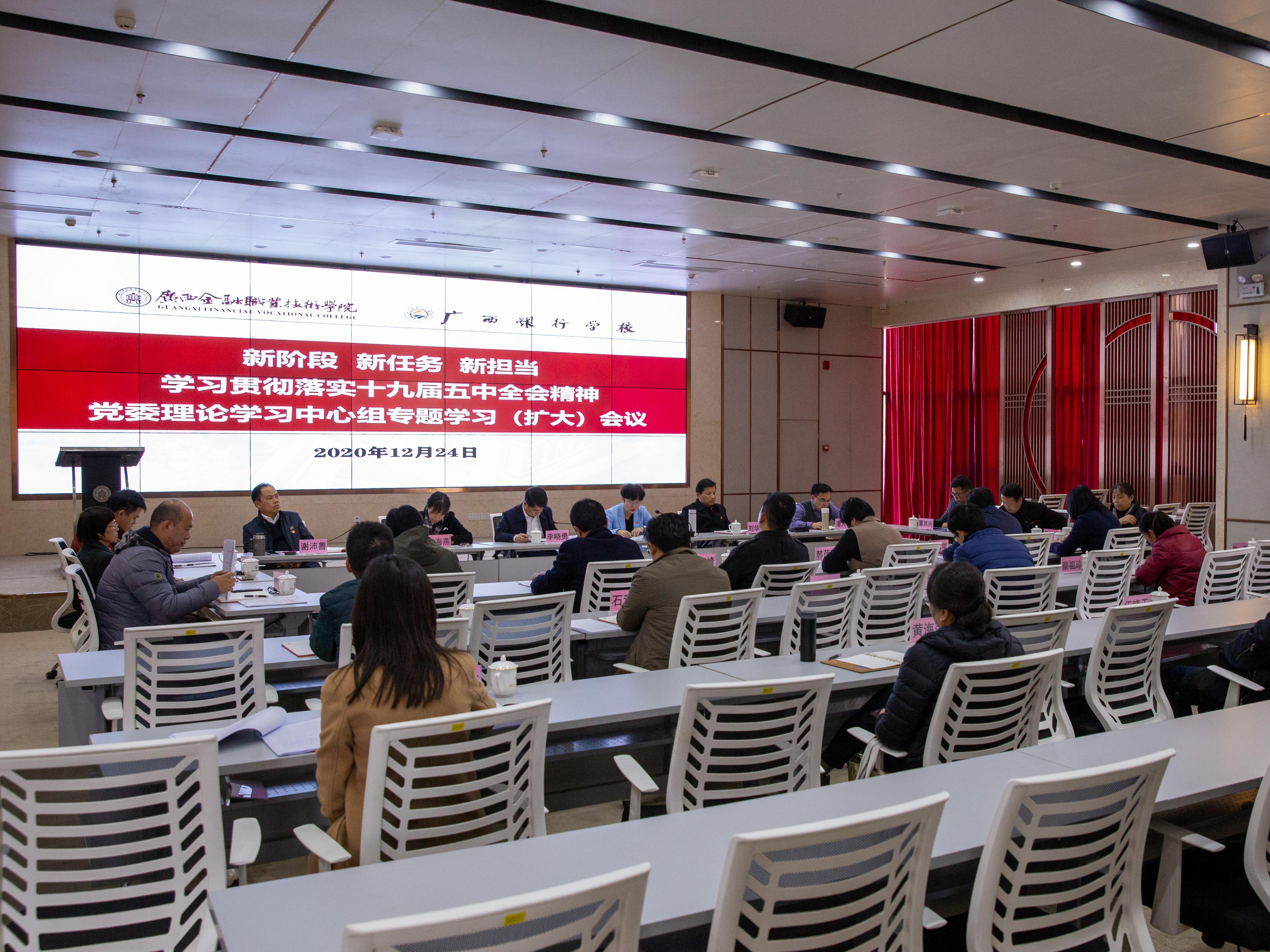 12月24日,我校黨委理論學習中心組2020年第七次專題學習(擴大)會在西校區道德大講堂召開,本次學習的主題是:新階段 新任務 新擔當——學習貫徹落實黨的十九屆五中全會精神。自治區黨委教育工委專職副書記、自治區教育廳黨組成員李曉勇同志到場巡聽旁聽,學校黨委理論學習中心組成員、非黨員校領導、各黨支部書記、各單位主要負責人參加會議,會議由黨委書記沈立君主持。