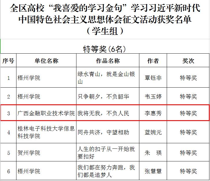 近日,自治區黨委教育工委辦公室公布全區高校“我喜愛的學習金句”學習習近平新時代中國特色社會主義思想體會征文活動獲獎名單。我校選送的6篇作品獲得學生組特等獎一項、優秀獎五項。