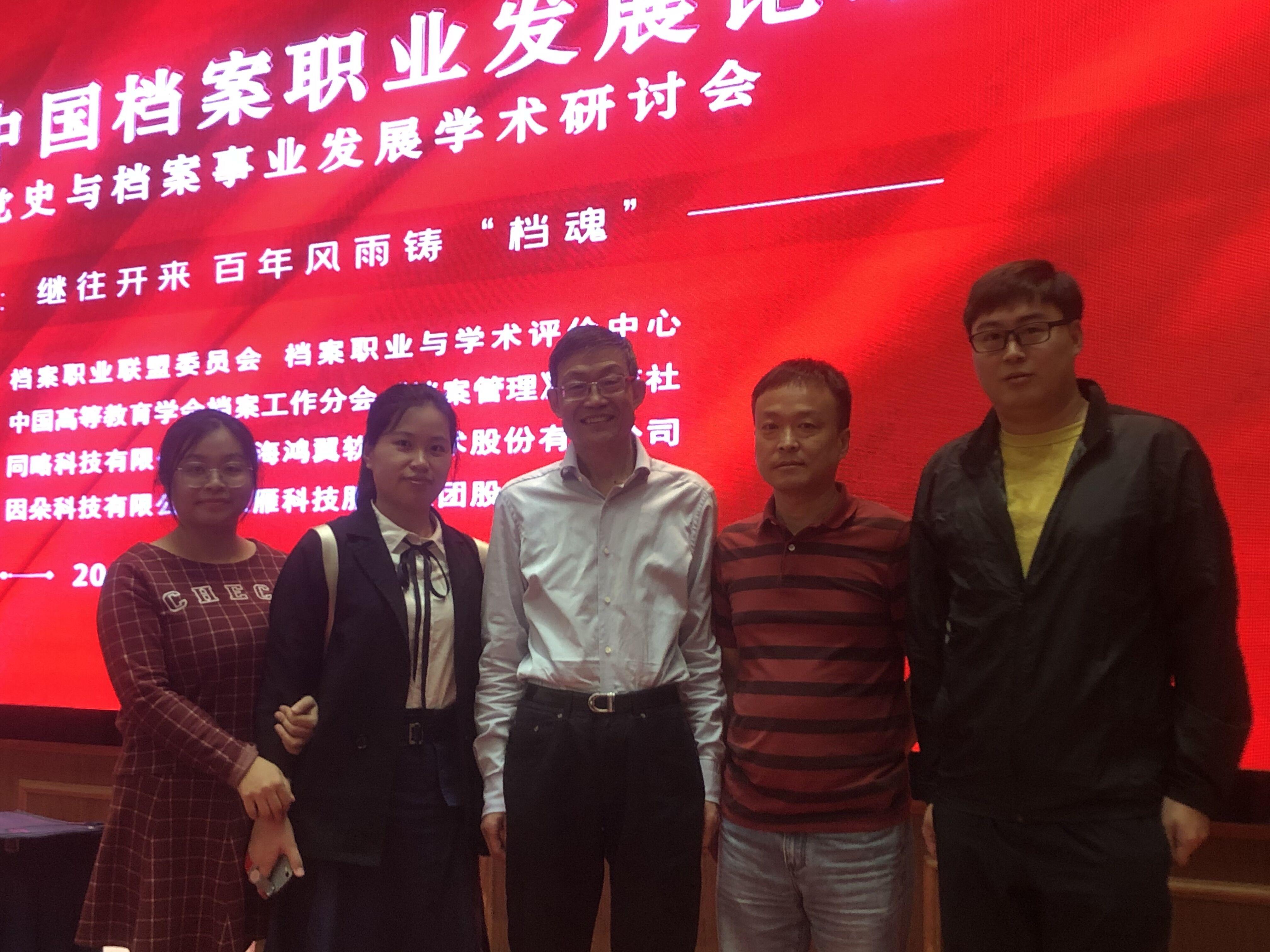 我校與會人員與國家檔案局原局長、中央檔案館原館長、中國檔案學會理事長楊冬權(中)合影留念