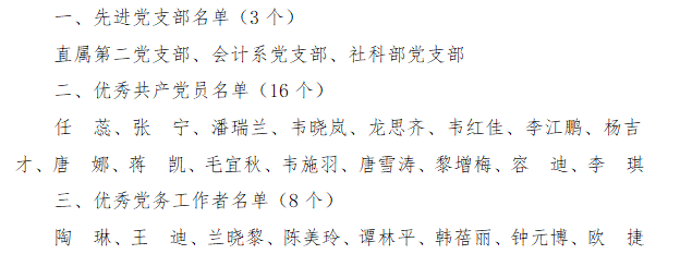 在本次表彰大會上,我校直屬第二黨支部等3個黨支部榮獲直屬機關先進基層黨組織榮譽稱號,任蕊等16名同志獲得優秀共產黨員稱號,陶琳等8名同志獲得優秀黨務工作者榮譽稱號。