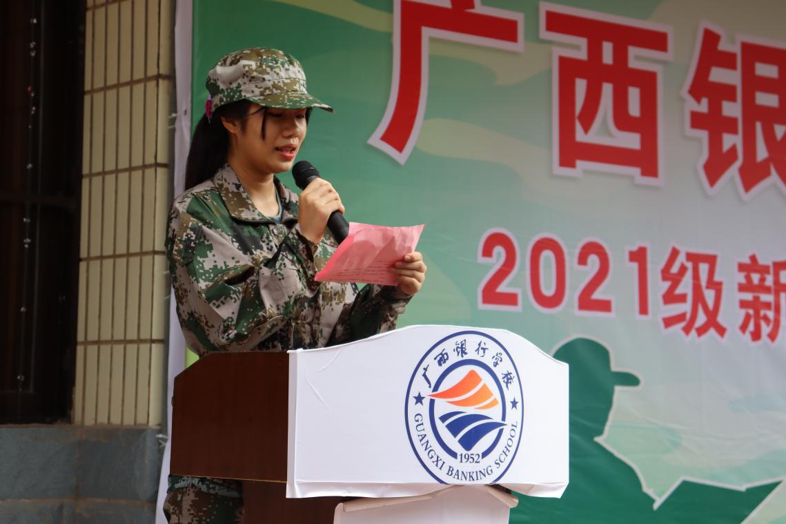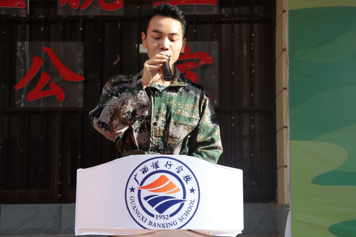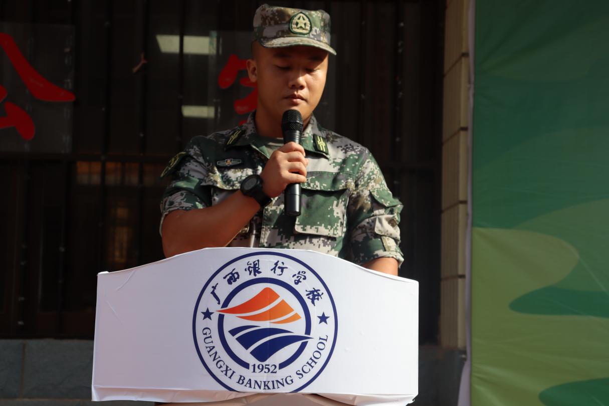 廣西銀行學校管委會副主任陳瑞強作新生軍訓動員講話,希望同學們敢于吃苦,敢于鍛煉,服從命令、聽從指揮,切實做到軍人"流血流汗不流淚,掉皮掉肉不掉隊"的要求,達到強體能、練毅力、知軍事、明紀律的目的。