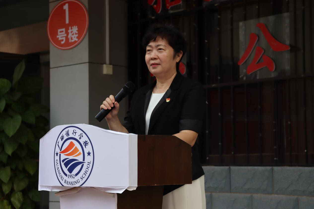 五星紅旗冉冉升起,全體肅立,奏唱國歌,大會正式開始。廣西金融職業技術學院(廣西銀行學校)黨委書記沈立君為新生開學典禮致辭;她向全體師生寄予了三點希望和要求,表明了學校對2021級新生的期許與祝福,希望2021級新生有責任、有擔當,好好學習,健康成長為一名高素質人才。