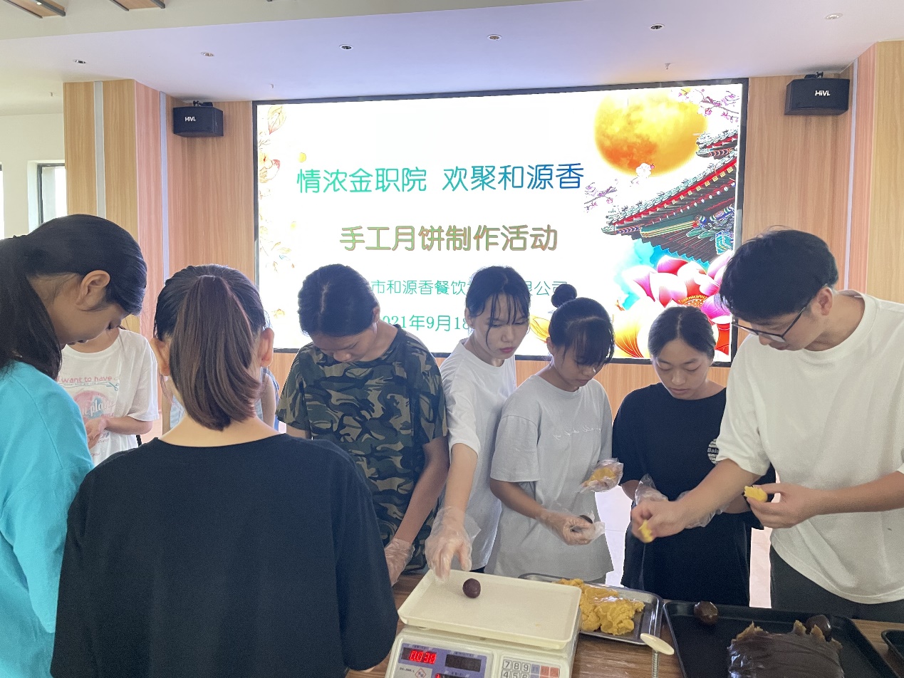 2021年9月18日,中秋節前夕,我院資助科聯合南寧市和源香餐飲有限公司組織我院20級的勤工助學的30位學生開展了主題為《情濃金職院,歡聚和源香》的手工月餅制作活動。