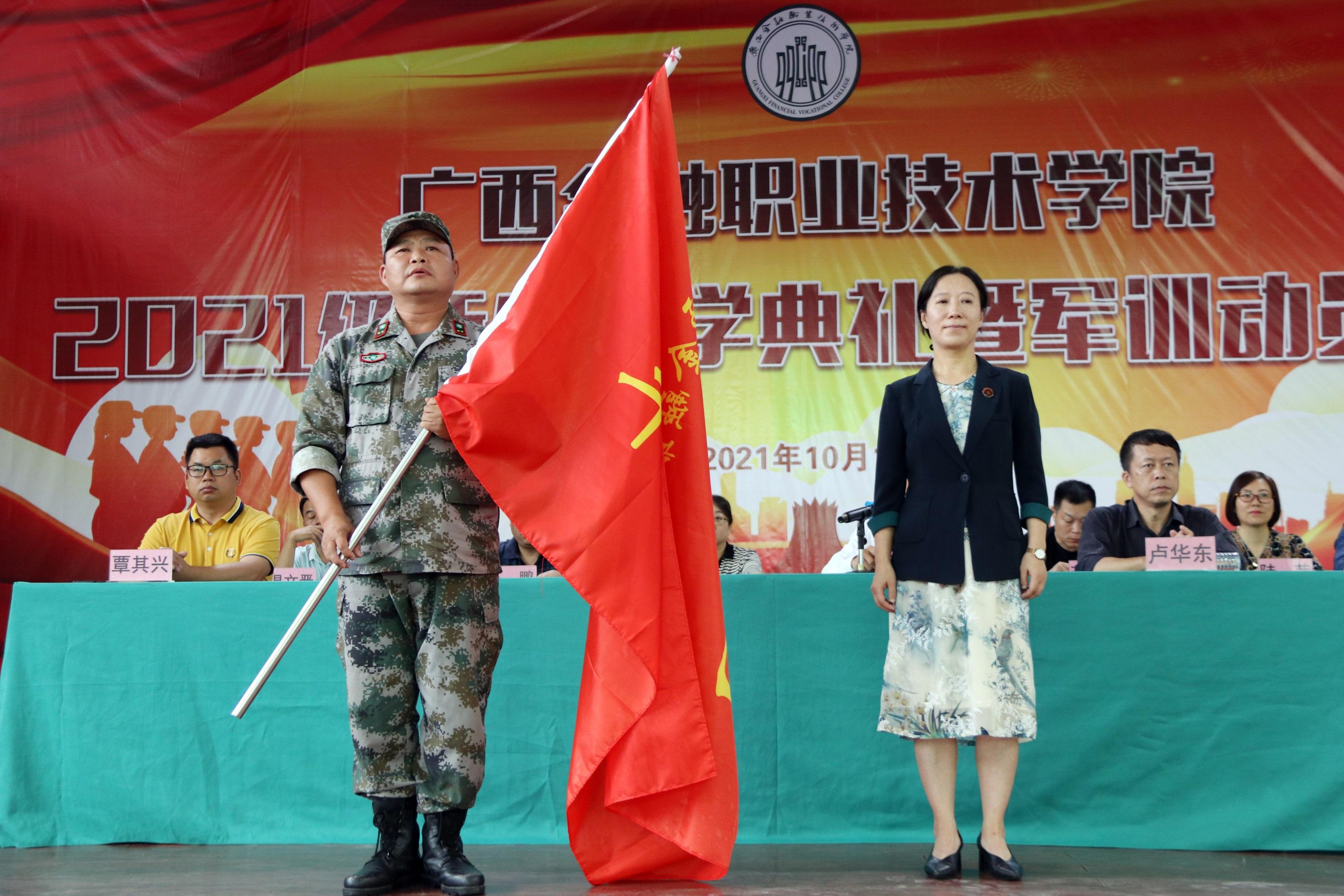 沈立君書記、莫海燕院長分別向承訓單位廣西陸戰教育學生軍訓基地授軍訓團團旗,鮮紅的旗幟在空中高高飛揚,標志著我校2021級學生軍訓正式拉開帷幕。