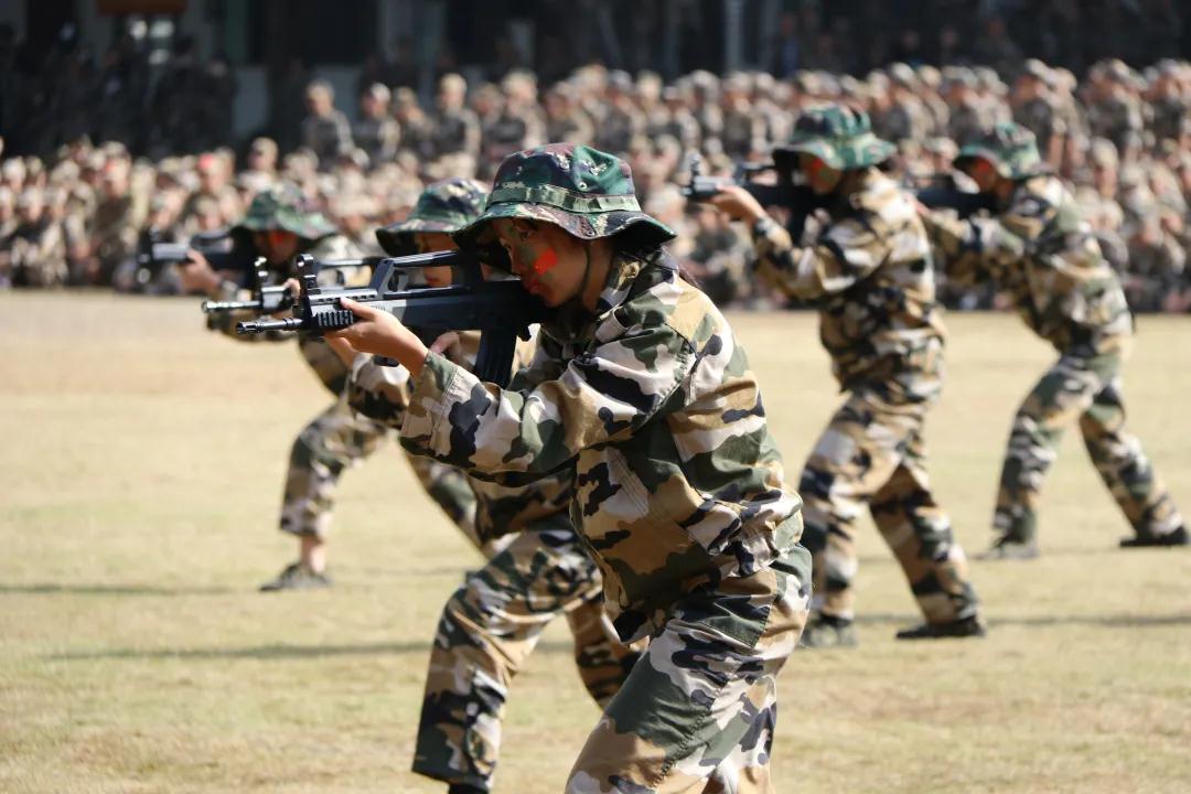 大會在雄壯的國歌聲中拉開帷幕,隨后各個方隊進行了隊列動作、匕首操、擒敵拳、戰術表演、花樣隊列的展示。經過兩周軍訓生活的歷練,參訓學生以高昂的士氣、響亮的口號、整齊的隊列和鏗鏘有力的步伐,展示了軍訓成果,展現了金院學子飽滿的激情和昂揚的姿態。
