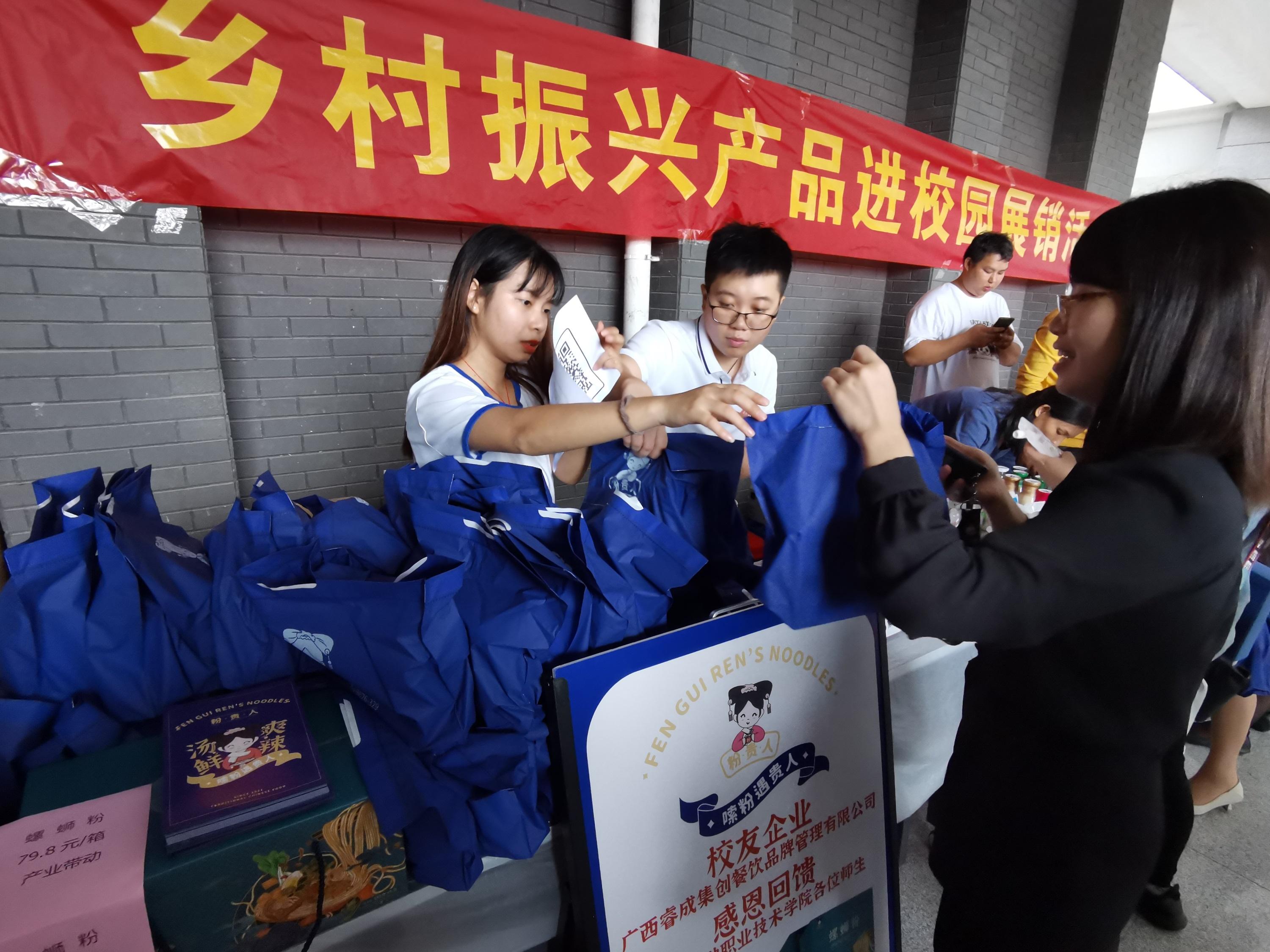活動還邀請了我院(校)優秀畢業校友廣西睿成集創餐飲品牌管理有限公司成睿明董事長,帶著創業團隊和自創品牌“粉貴人”螺螄粉產品回校,為學校教職工帶來伴手禮感恩回饋母校。