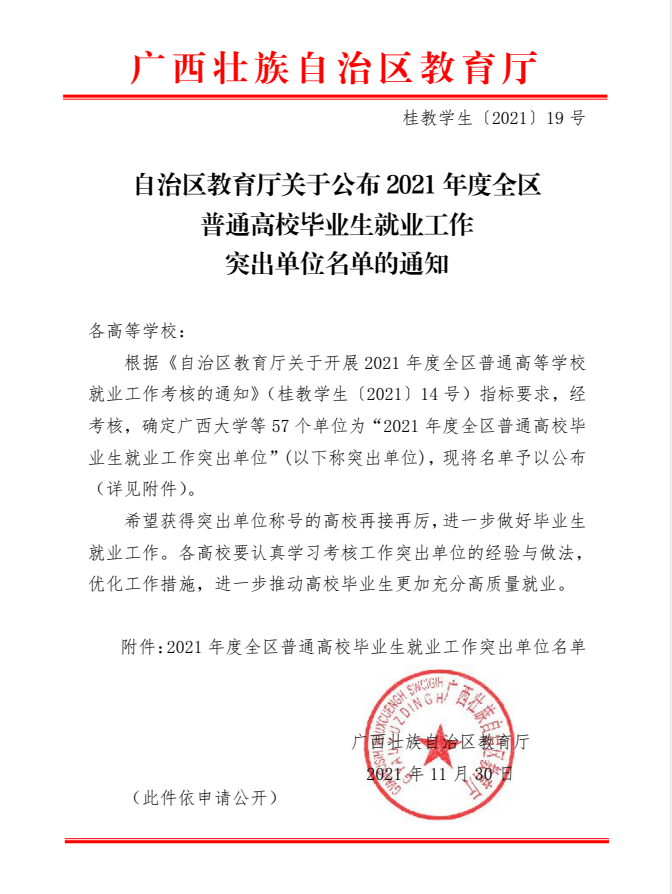 近日,自治區(qū)教育廳發(fā)文通報(bào),我校榮獲“2021年度全區(qū)普通高校畢業(yè)生就業(yè)工作突出單位”。