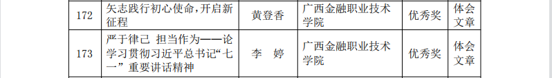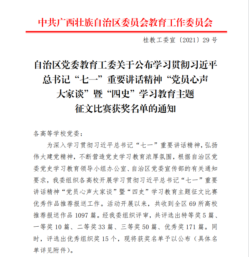 近日,自治區黨委教育工委印發《關于公布學習貫徹習近平總書記“七一”重要講話精神“黨員心聲大家談”暨“四史”學習教育主題征文比賽獲獎名單的通知》,公布了學習貫徹習近平總書記“七一”重要講話精神“黨員心聲大家談”暨“四史”學習教育主題征文比賽的獲獎名單。我校韓蓓麗同志榮獲二等獎,黃登香、李婷兩位同志獲得優秀獎。