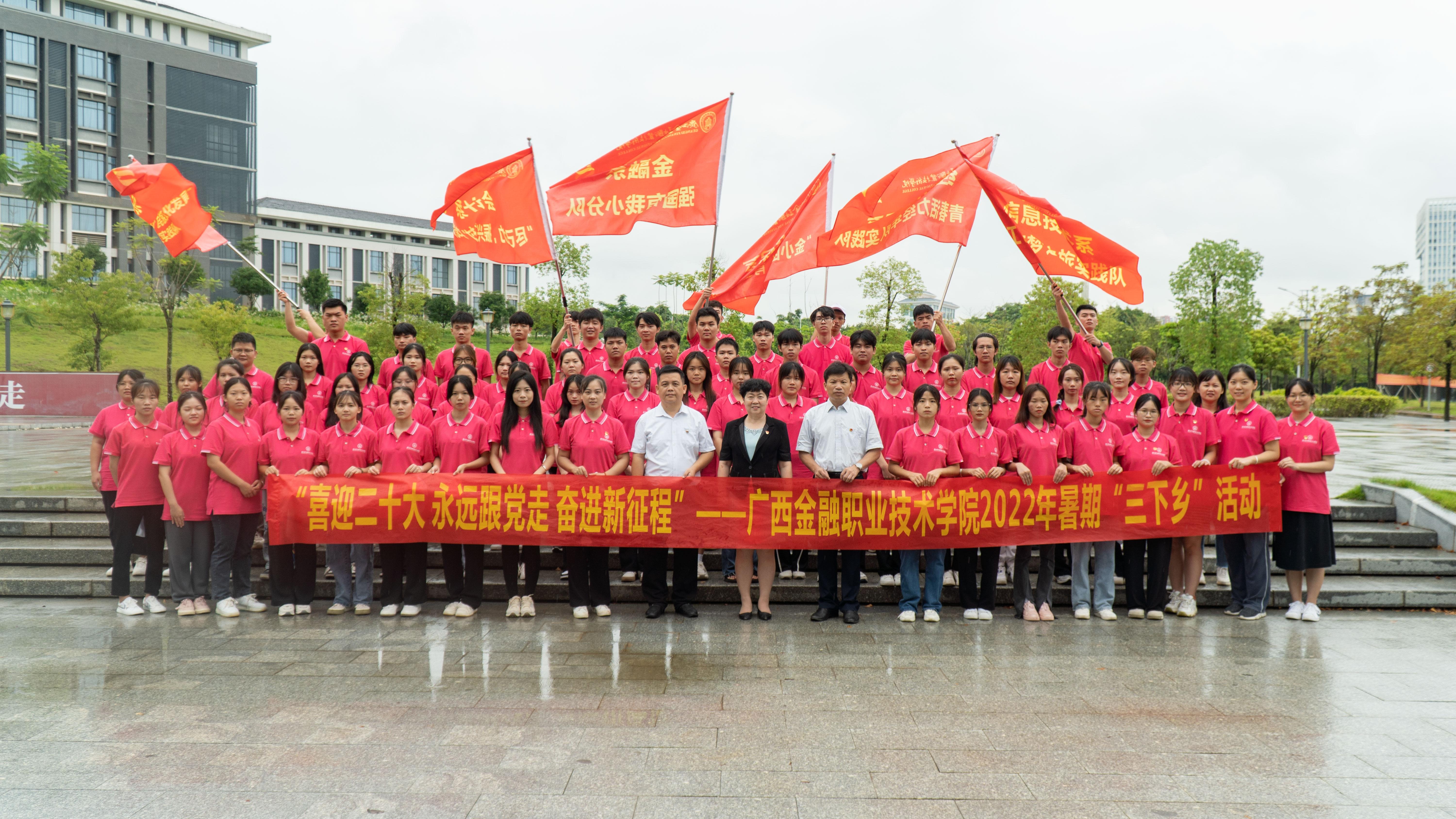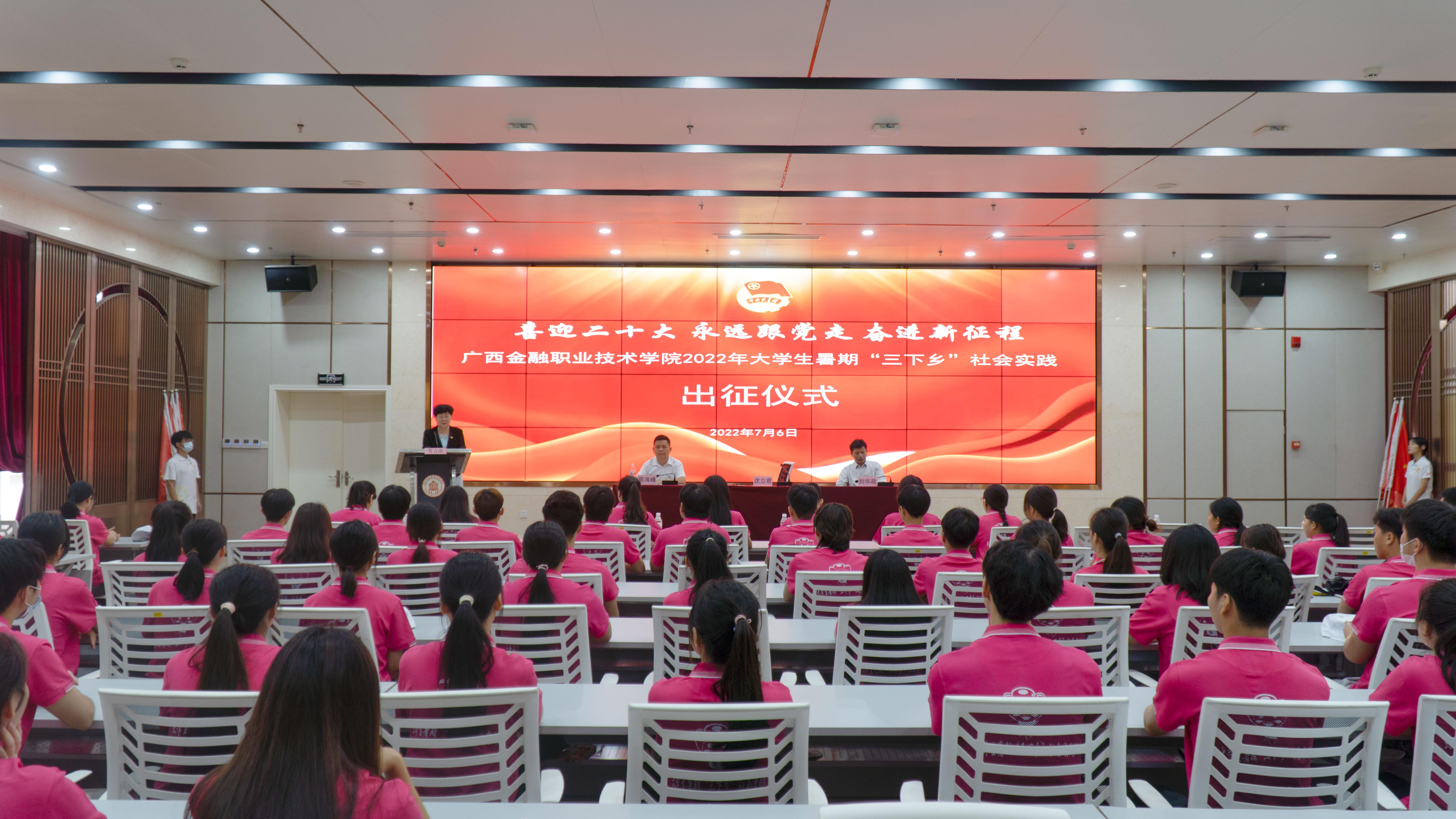 為進(jìn)一步深入學(xué)習(xí)領(lǐng)會(huì)習(xí)近平新時(shí)代中國特色社會(huì)主義思想,貫徹落實(shí)習(xí)近平總書記在慶祝中國共產(chǎn)主義青年團(tuán)成立100周年大會(huì)上的重要講話精神,引導(dǎo)和幫助廣大青年學(xué)生上好與現(xiàn)實(shí)相結(jié)合的“大思政課”,在社會(huì)課堂中受教育、長才干、作貢獻(xiàn),努力成為擔(dān)當(dāng)民族復(fù)興大任的時(shí)代新人,以實(shí)際行動(dòng)迎接黨的二十大勝利召開。7月6日,“喜迎二十大、永遠(yuǎn)跟黨走、奮進(jìn)新征程”廣西金融職業(yè)技術(shù)學(xué)院2022年暑期“三下鄉(xiāng)”大學(xué)生社會(huì)實(shí)踐活動(dòng)出征儀式在西校區(qū)道德大講堂順利舉行。校黨委書記沈立君,校黨委副書記、紀(jì)委書記劉華政出席出征儀式。參加出征儀式的還有校團(tuán)委、各系分團(tuán)委專職團(tuán)干、社會(huì)實(shí)踐帶隊(duì)老師及學(xué)生代表。本次出征儀式由學(xué)生工作與招生就業(yè)處副處長、校團(tuán)委書記周海峰主持。