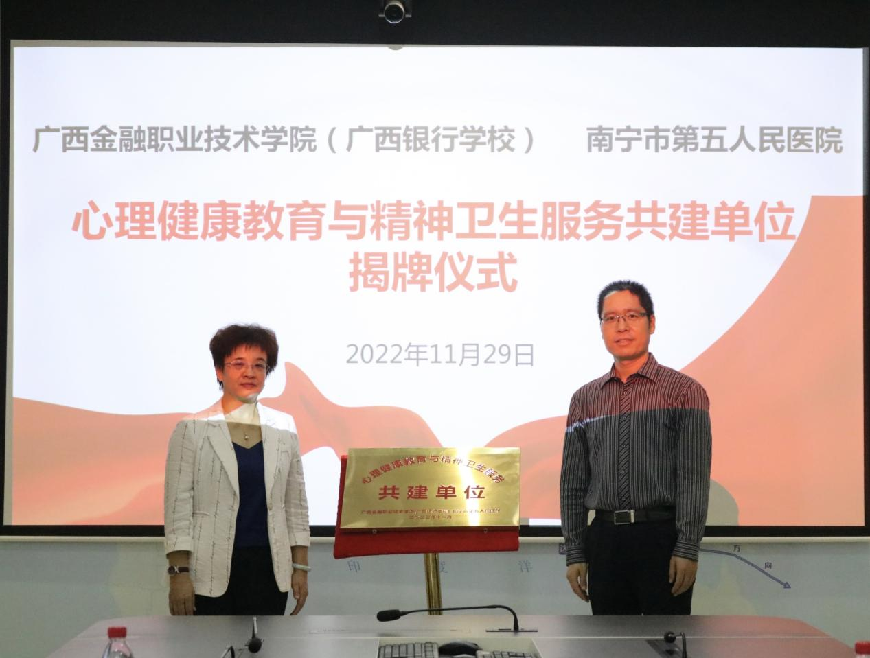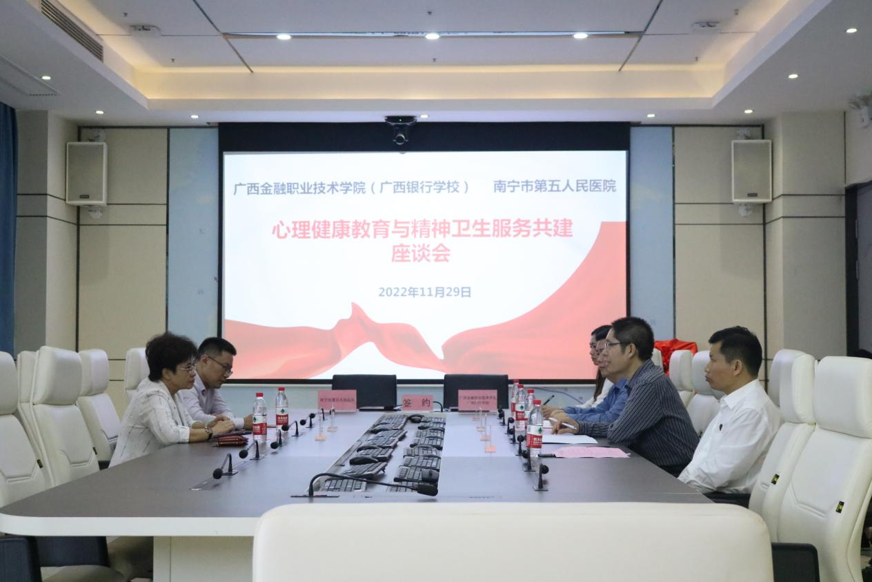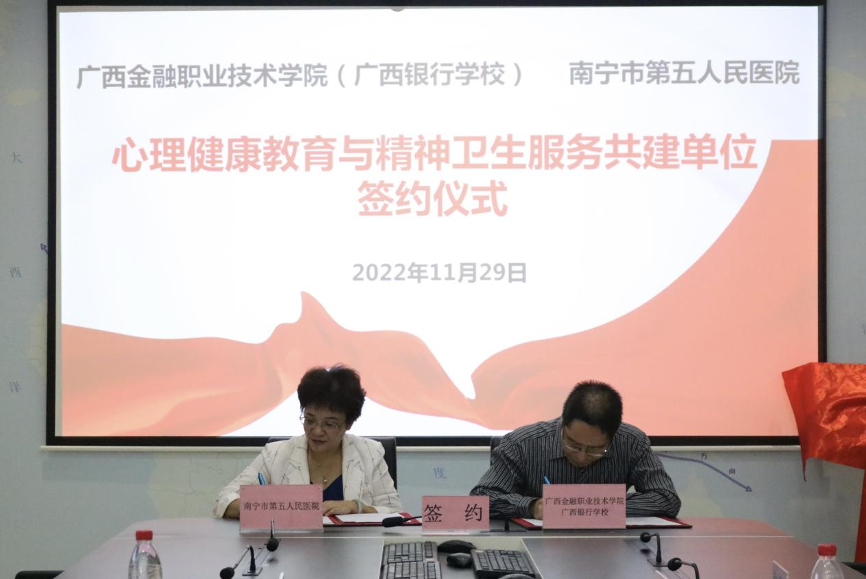2022年11月29日,我院與南寧市第五人民醫(yī)院的心理健康教育與精神衛(wèi)生服務(wù)合作共建單位簽約揭牌儀式在西校區(qū)行政樓103會(huì)議室順利舉行。南寧市第五人民醫(yī)院黨委書(shū)記張玲、心理健康科科主任蔣春雷參加簽約揭牌儀式,我院黨委書(shū)記李高巖、黨委副書(shū)記、紀(jì)委書(shū)記劉華政,學(xué)生工作與招生就業(yè)處處長(zhǎng)校周海峰,與心理健康教育專(zhuān)職教師代表、各系教師代表共同出席。