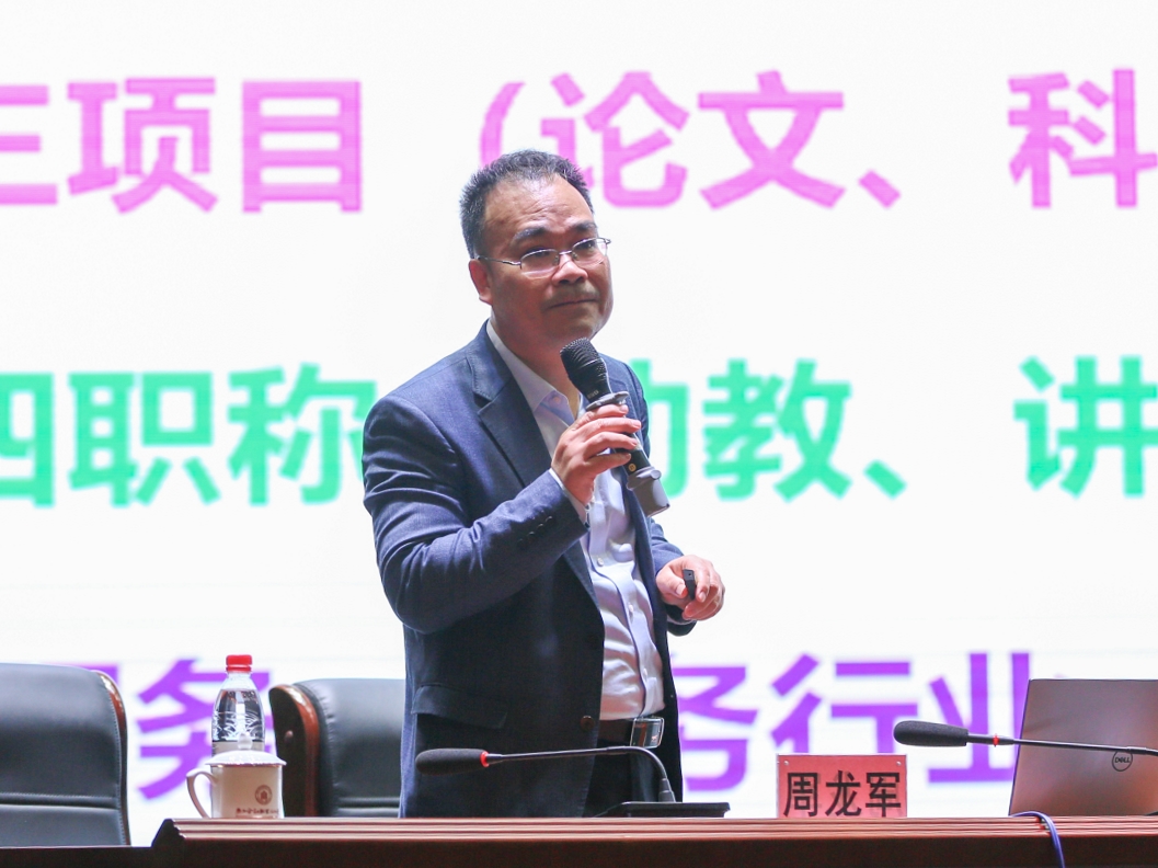 周龍軍教授以“夢(mèng)想起航:高校教師職業(yè)生涯進(jìn)階發(fā)展”為主題,通過“為什么想當(dāng)一名老師”“想成為怎樣一名老師”“怎樣成為一名優(yōu)秀老師”三方面分享了自己從教30多年的成長(zhǎng)歷程和育人心得,他用發(fā)人深省的故事,鮮活生動(dòng)的案例,深入淺出地為我們?cè)忈屃俗鳛橐幻鈽s的人民教師的意義與價(jià)值、方向與目標(biāo)、路徑與方法,其幽默的語(yǔ)言令大家如沐春風(fēng),樂觀的心態(tài)深深地感染著在場(chǎng)的每一位教職工。周教授在講座上指出,做一名老師是快樂幸福而有意義的,要不斷提高道德修養(yǎng),要成為一名優(yōu)秀的教師必須做“六有”教師、要做科研寫論文、要開展校企合作。