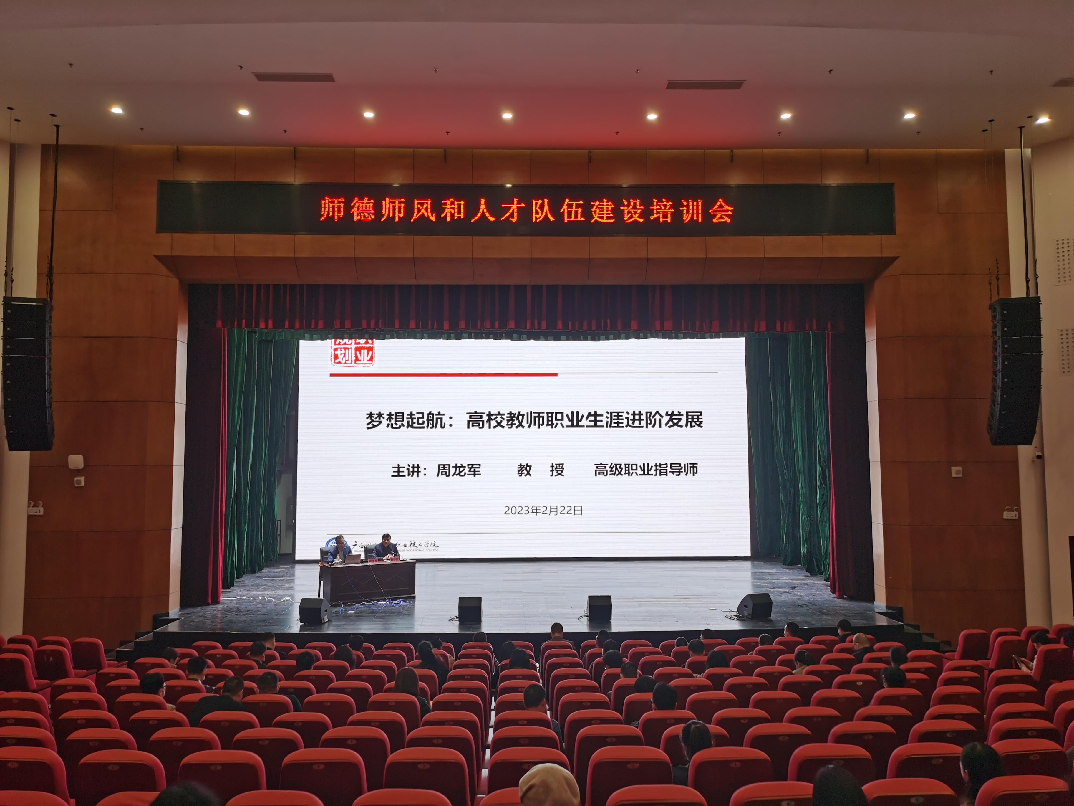 為加強(qiáng)學(xué)校師德師風(fēng)建設(shè)、提高人才隊(duì)伍建設(shè)水平,幫助廣大教職員工增強(qiáng)職業(yè)規(guī)劃意識(shí)。2月22日下午,學(xué)校特邀請(qǐng)廣西國(guó)際商務(wù)職業(yè)技術(shù)學(xué)院教授、國(guó)家高級(jí)職業(yè)指導(dǎo)師周龍軍教授為全校教職工開展師德師風(fēng)和人才隊(duì)伍建設(shè)培訓(xùn)。培訓(xùn)由學(xué)校黨委副書記、紀(jì)委書記劉華政主持。