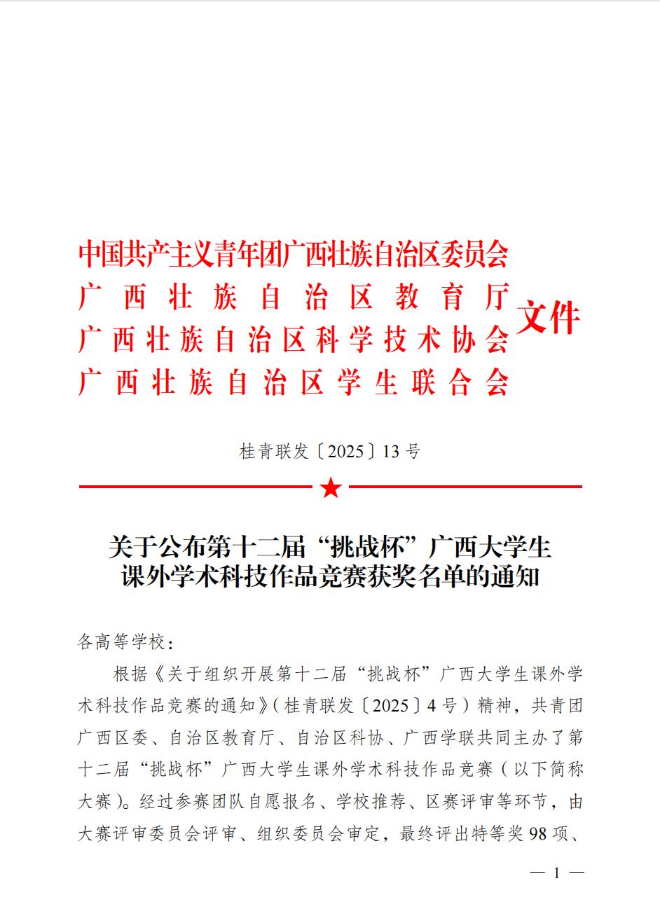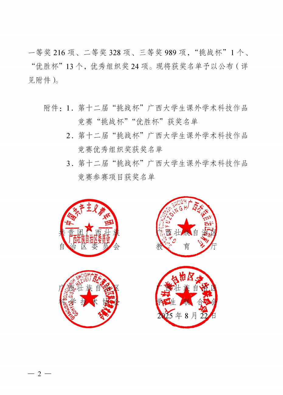近日,由共青團廣西區委、自治區教育廳、自治區科協、廣西學聯共同主辦的第十二屆“挑戰杯”廣西大學生課外學術科技作品競賽獲獎名單正式公布。本次比賽吸引全區79所高校、超10萬名師生踴躍參與,競爭異常激烈。